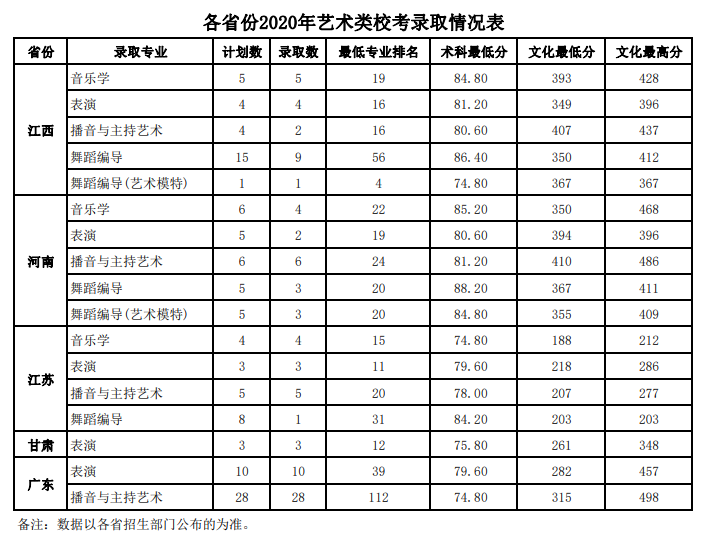 各省份2020年艺术类校考录取情况表